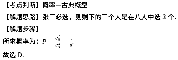 某公司有9名工程师,张三是其中之一,从中任意抽调4人组成攻关小组,包括张三的概率是( ).