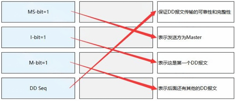 DD报文部分字段解释如下: I:当发送连续多个DD报文时,如果这是第一个DD报文,则置为1,否则置为0。 M (More):当发送连续多个DD报文时,如果这是最后一个DD报文,则置为0。否则置为1,表示后面还有其他的DD报文。 MS (Master/Slave):当两台OSPF路由器交换DD报文时,首先需要确定双方的主从关系,Router ID大的一方会成为Master。当值为1时表示发送方为Master。 DD sequence number:DD报文序列号。主从双方利用序列号来保证DD报文传输的可靠性和完整性。