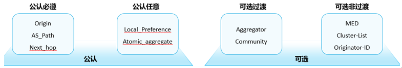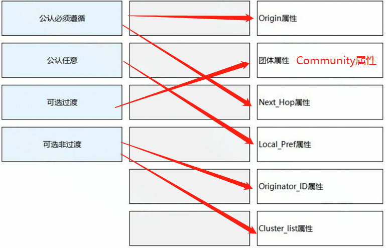 路由属性是对路由的特定描述,所有的BGP路由属性都可以分为4类。请将以下BGP常见属性和对应的类型进行匹配。(Token可重复使用)
