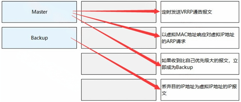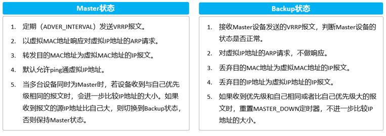 VRRP中Master状态与Backup状态的设备工作如下: