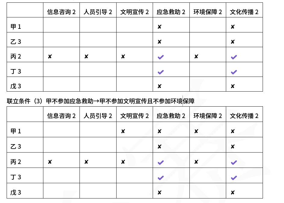 2022年北京冬奥会的志愿者甲、乙、丙、丁、戊5人分别参加了“信息咨询”“人员引导”“文明宣传”“应急救助”“环境保障”“文化传播”等6项志愿服务中的1~3项,这6项志愿服务中的每项均有上述5人中的2人参 加。已知: