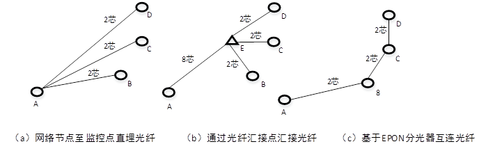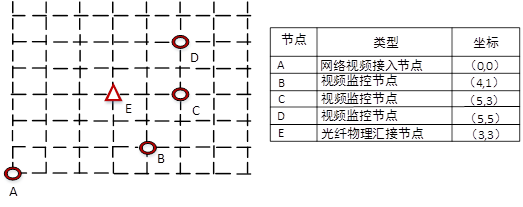 运营商网络中的某一个网络视频接入节点,需要通过一台交换机实现三个监控点摄像机的视频图像接入,摄像机和交换机之间采用光纤进行互连,并存在一个光纤物理汇接节点(用于实现光纤的熔接配置)。各节点的类型、分布和位置坐标如图1-2所示,允许采用2芯、4芯、8芯或16芯的光缆。请指出采用“网络节点至监控点直埋光纤”、“通过光纤汇接点汇接光纤”、“基于EPON分光器互连光纤”三种方式需要埋设的光缆类型并计算所需每种类型光缆的最短长度。(注:在计算长度时, 直接可在计算结果中出现。)
