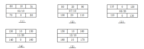 请根据上图和甘特图计算部分节点最早开始时间、最早完成时间、最迟开始时间、最迟完成时间、总时差和自由时差,并将这些节点信息在答题纸上填写完整。