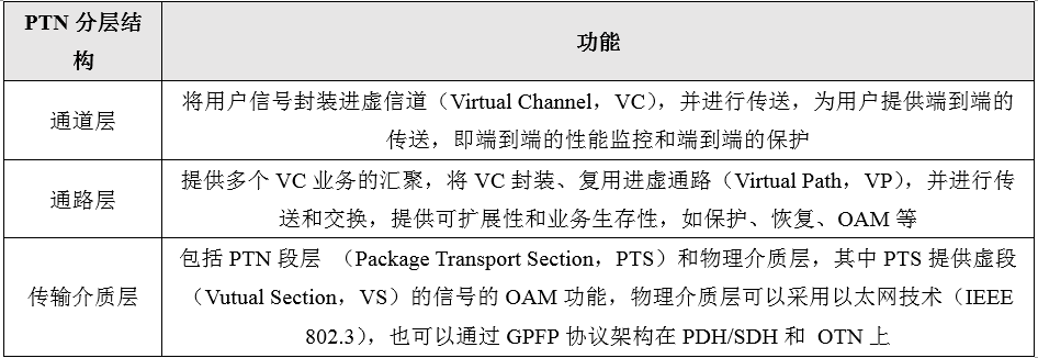PTN网络结构分为通道层、通路层和传输介质层。PTN支持在分层的基础上,再将PTN分割为若干个分离的部分,即支持大的域继续分割为多个小的子域。这种网络的分层和分域使得PTN具有良好的可扩展性。