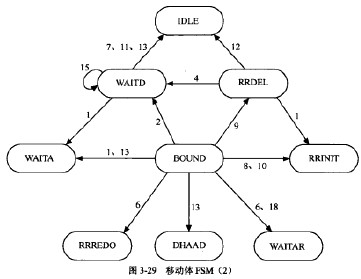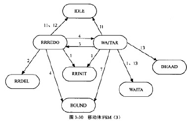 由于移动节点中的信息最为复杂,包括发送HoTI和CoTI、接收HoT和CoT、发送BU、接收BA、BRR、MD等,而且它们之间还互相影响,有必要建立一个存限状态的状态机来表乐这种复杂的变化。可以设计如图3-28、阁3-29、图3-30所示的FSM,图中的双向线表示两个状态在某种条件下可以互相转移,单向线表示可以向方转移。为了图的简洁,其中的触发事件和发生的条件并没有标出。涪要说明的是有些状态在事件触发下不会发生状态转移,而且还可能退出FSM,图中没有标出这样的悄况。